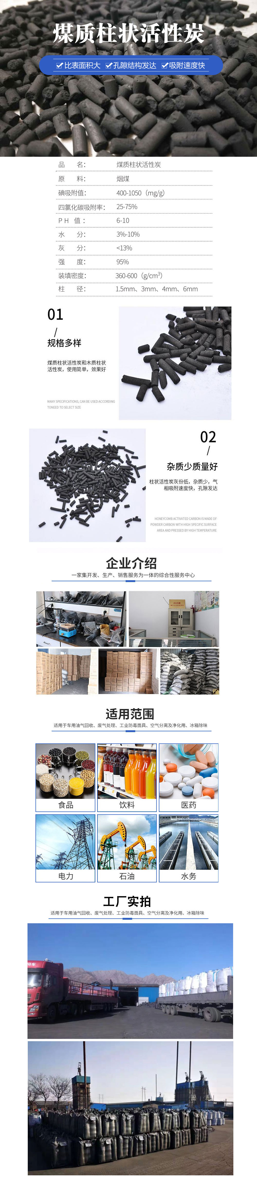 柱狀活性炭是以煤炭為原料、以煤油為粘合劑、經磨粉、混配、擠壓成形、炭化、活化而成的圓柱形活性炭。該產品比表面積大、孔隙發達、強度高、吸附能力強、化學穩定性好、可廣泛應用于化工、制藥、食品等各種氣體的有害有毒及微生物凈化過濾、對低拂點的苯類、醇類、四氯化碳、三氯甲烷等有害氣體有很好的吸附作用,活性炭吸